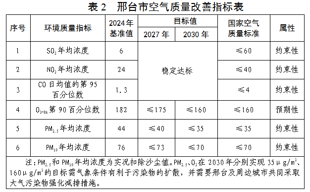 认真落实《空气质量持续改善行动计划》《京津冀及周边地区大气污染防治提质增效行动方案》《河北省空气质量持续改善行动计划实施方案》等文件要求,大力推进能源结构调整、落后产能淘汰、移动源结构调整和扬尘源综合治理减排量,综合考虑本地减排、区域联防联治及经济增长因素,基于2023年邢台市大气污染物与温室气体融合排放清单,经测算,到2030年,全市SO2、NOx、VOCs、NH3、一次PM2.5分别较2023年减排4588吨、35191吨、52421吨、25140吨、13891吨,下降55%、31%、29%、10%和50%,可确保我市空气质量达标。